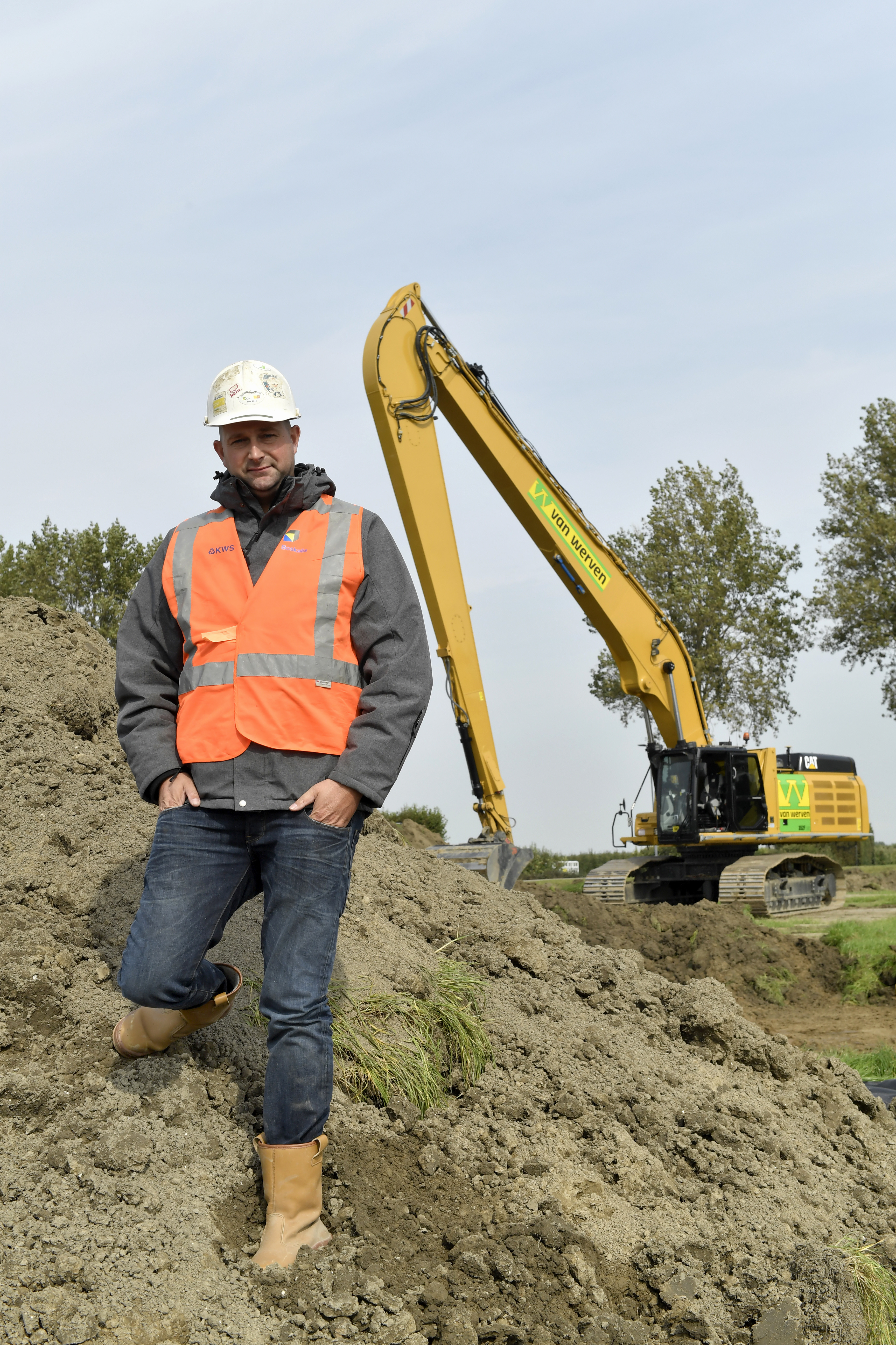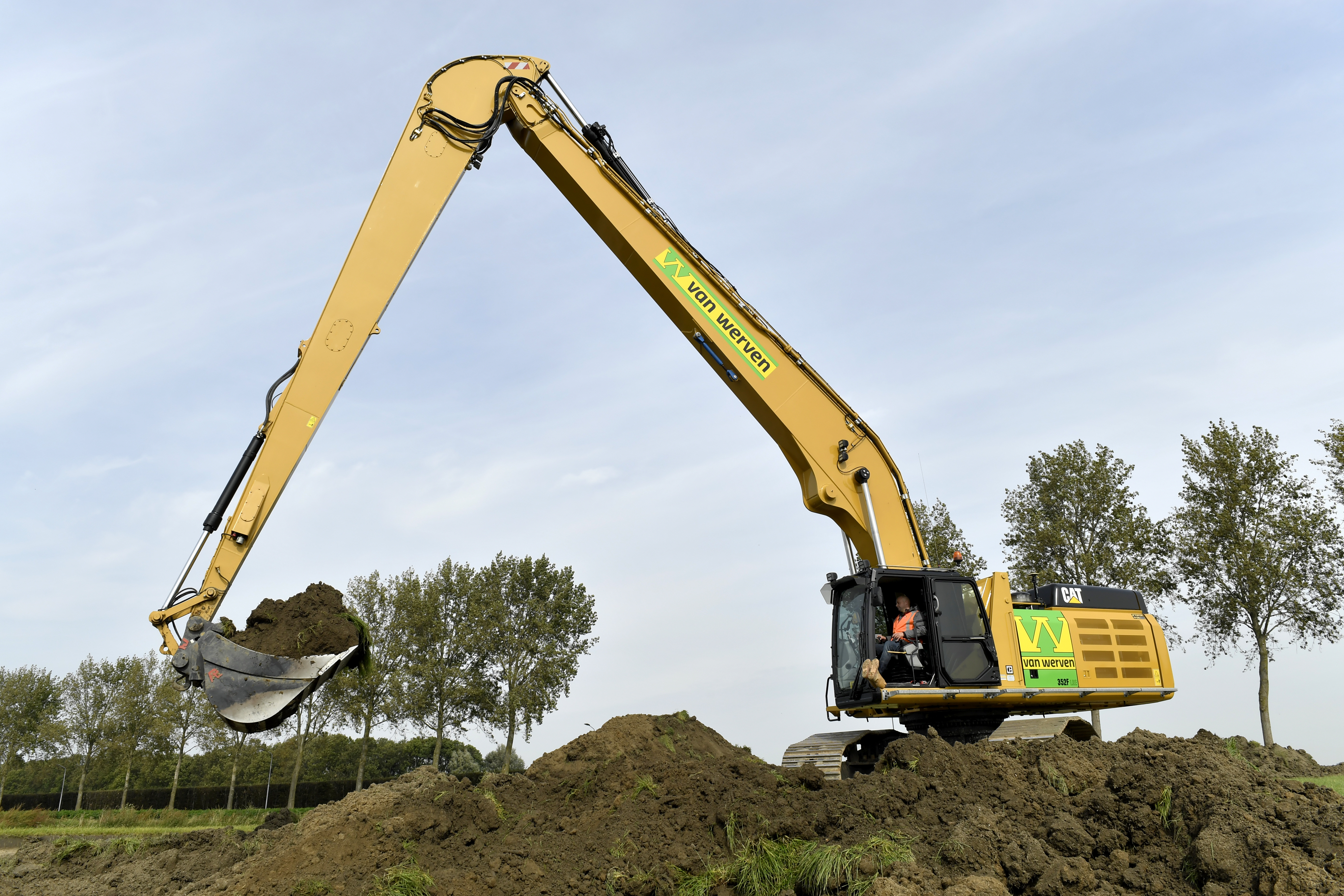Sinds dit voorjaar werkt Pieter op een heel bijzondere machine: een Cat 352F LRE met aangepaste giek, 21 meter bereik, en de leidingen in de giek in plaats van erop. 'Volgens mij is dat uniek in Nederland, en misschien zelfs wel in de wereld. De giek is gemaakt door Snijder in Hoorn. De cabine van de machine kan omhoog en omlaag, dat is voor een graafmachine wel apart. Dat de leidingen in de giek zitten, is veiliger, en het is vooral fijn als je onder water per ongeluk tegen een damwand aan tikt. Dan hoef je er daarna alleen een beetje verf op te smeren, en hoef je niet meteen de leidingen te vervangen.'