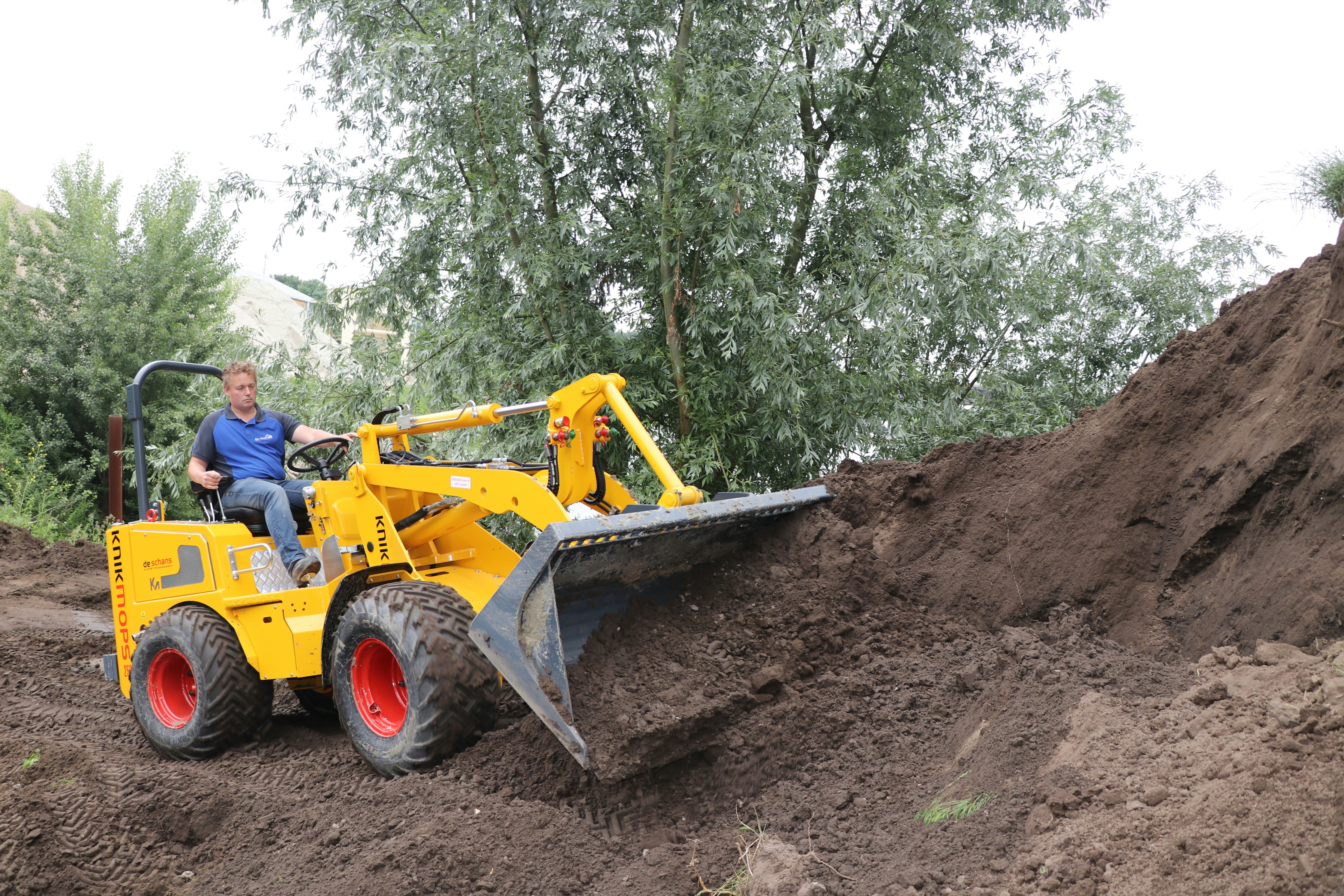 'De bediening is erg fijn en makkelijk, je stapt op de kniklader en je rijdt er meteen mee weg. De kracht van de KM 250 is fantastisch : je zet de machine in de eerste rijsnelheid, je duwt de bak in een bult zand en de machine slipt er af en toe gewoon van, zoveel power heeft de machine. Dat mag ik graag zien bij een minishovel. Hij moet wat over hebben in kracht en dat heeft ‘ie. Ook bij het heffen is deze shovel super-fanatiek.’