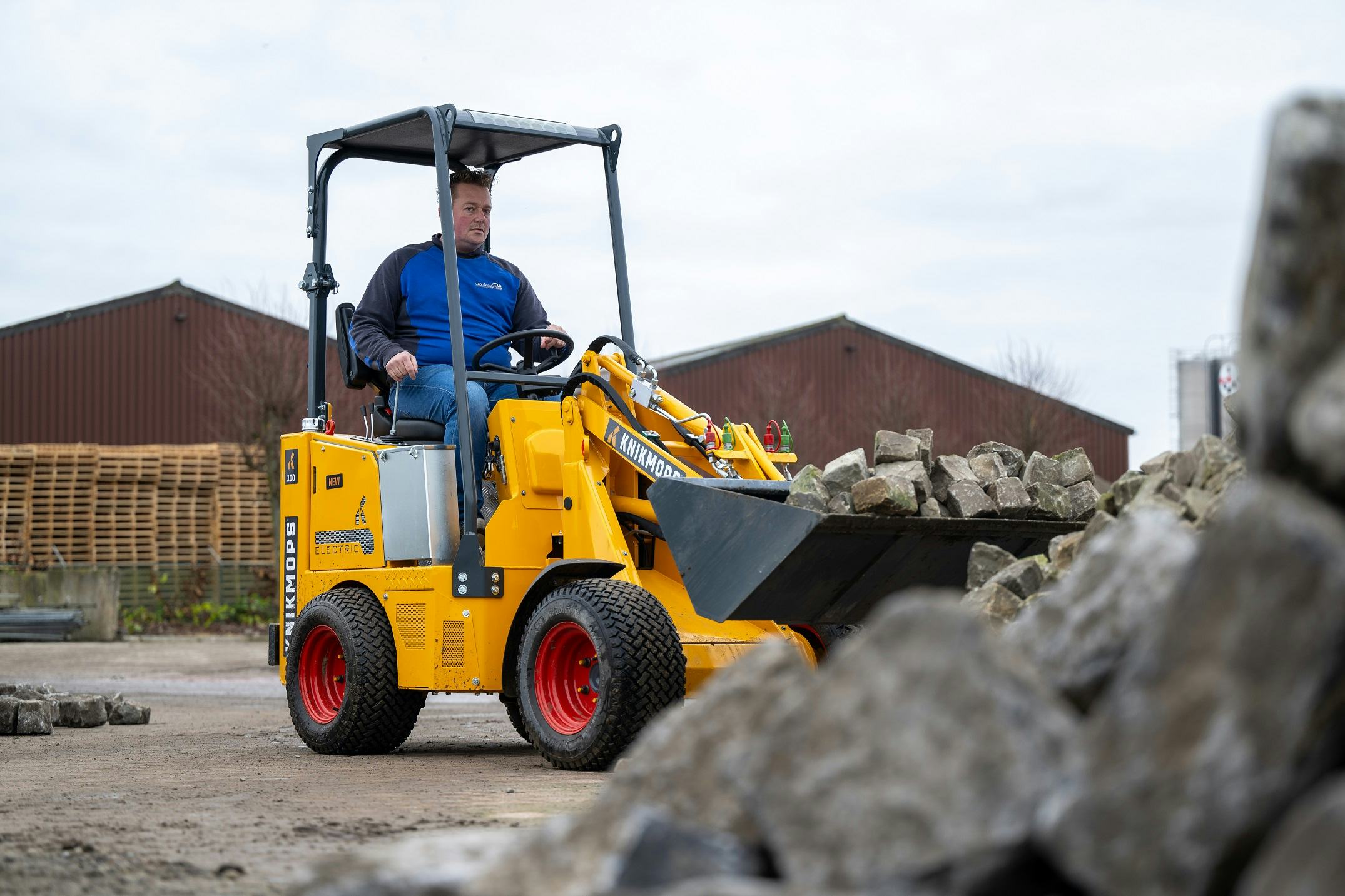 ‘Een bak vol scheppen, is geen enkel probleem. Je zet de machine in de eerste snelheid en je duwt de bak in de bult zand. De machine geeft kracht en slipt ervan, zoveel power heeft ‘ie. Dat mag ik graag zien bij een mini-shovel. Hij moet wat over hebben in kracht en dat heeft deze Knikmops zeker. Ook in het tillen van spullen is deze machine superfanatiek, gezien zijn gewicht. Dat is een mooie bijkomstigheid.’