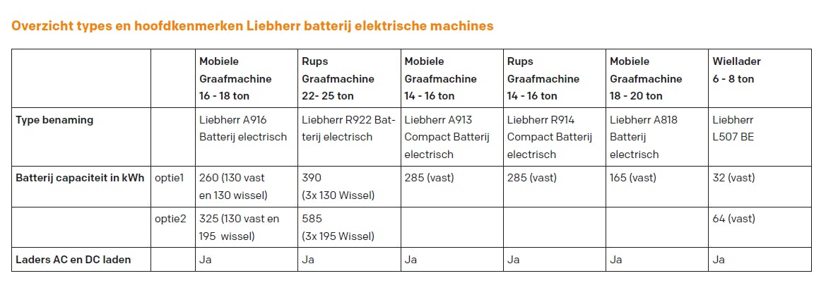 Vanaf 2025 komt een groeiend aantal van de batterij-elektrische machines direct vanuit de Liebherr-fabriek, als 100% batterij elektrisch. Ombouw van dieselaangedreven materieel is dan voor deze machinetypes niet meer benodigd. Bij het ontwerp van deze machines is alles gericht op langdurig en veilig emissieloos draaien. Het resultaat: kwalitatief hoogwaardige machines waarmee een volledige werkdag gedraaid kan worden tegen een acceptabele prijs.