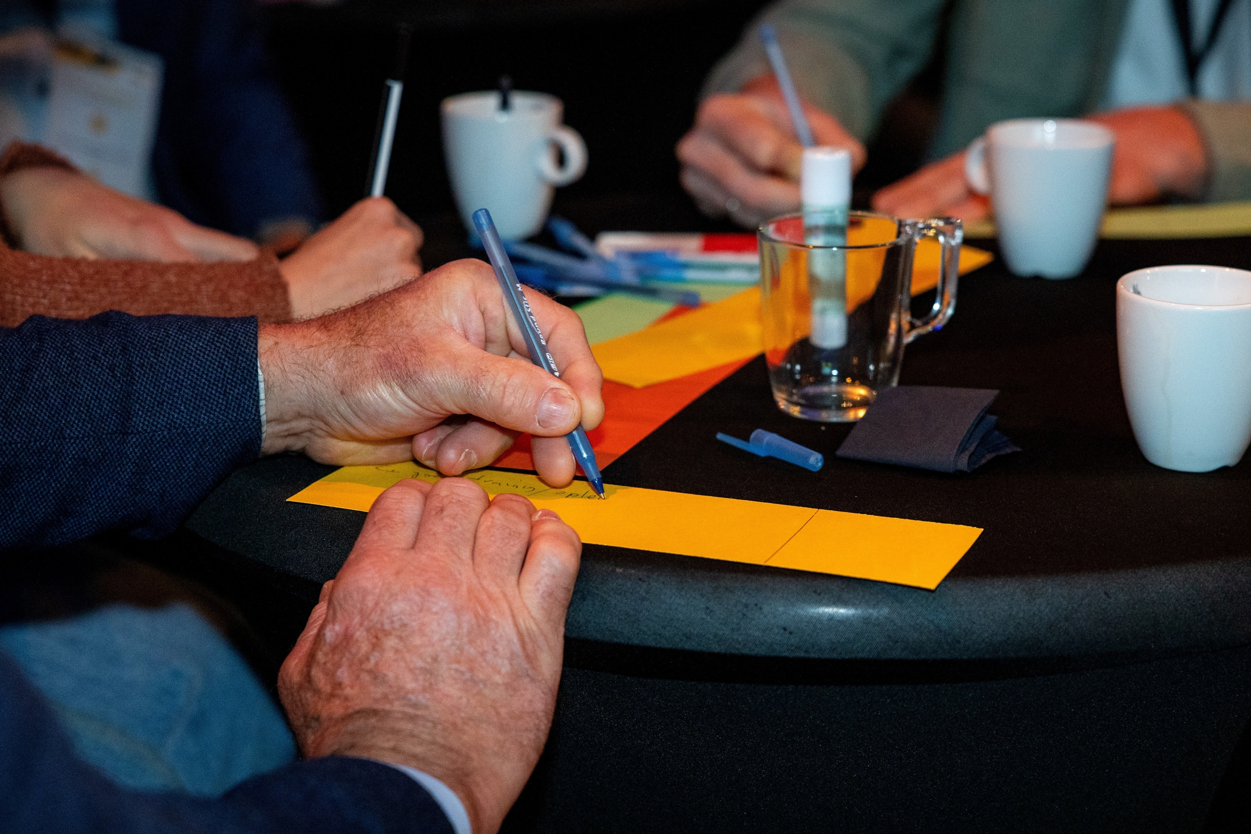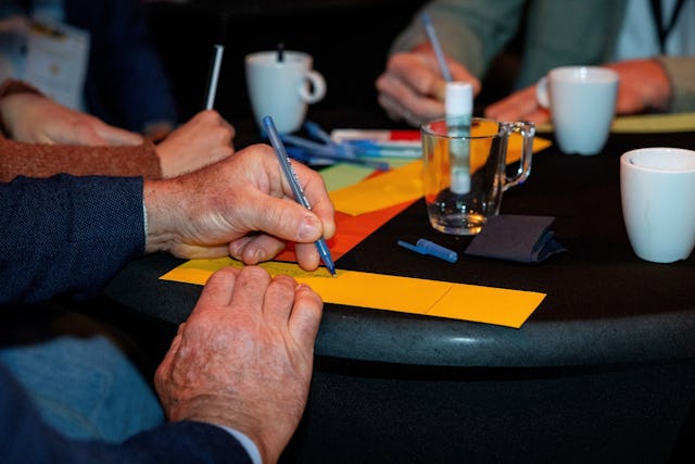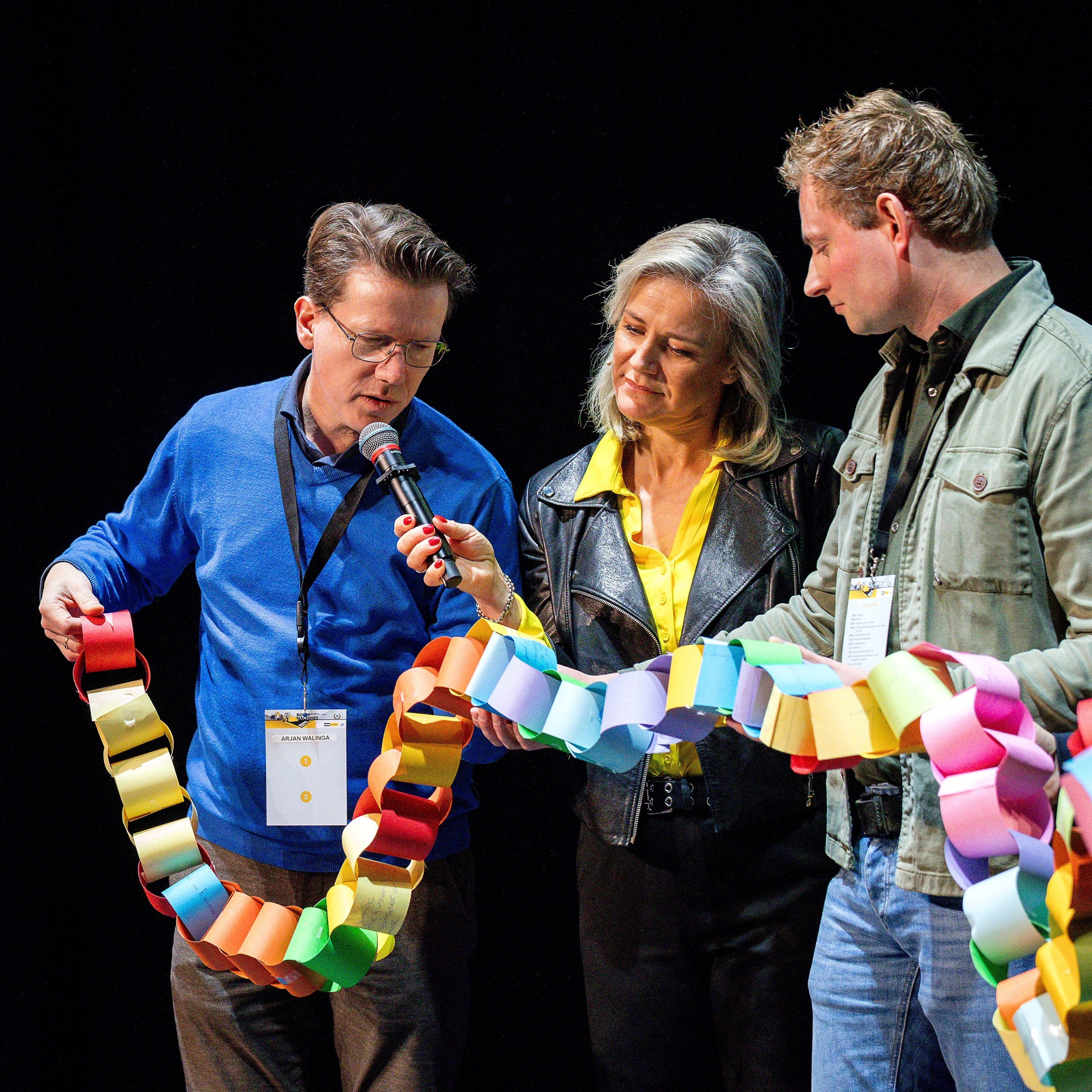Aanwezigen die dachten lekker de hele dag te kunnen zitten en luisteren werden teleurgesteld. Ook van hen werd actie verwacht. Op de vraag ‘welke kleine verandering kun jij morgen al doorvoeren om het werk slimmer, duurzamer of veiliger te maken?’ werden heel wat kleurige strookjes papier volgeschreven. Al die stroken werden samengevoegd tot één lange keten van goede ideeën, die de ketensamenwerking in de sector symboliseerde.