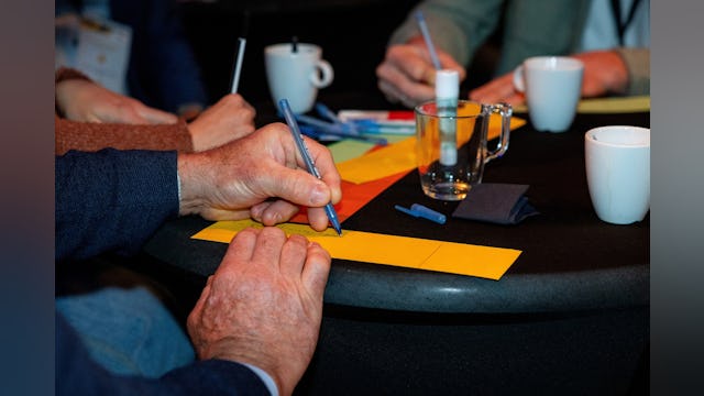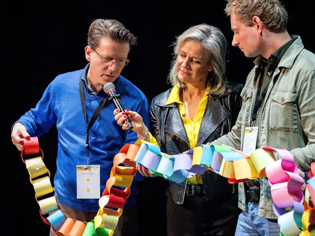 Aanwezigen die dachten lekker de hele dag te kunnen zitten en luisteren werden teleurgesteld. Ook van hen werd actie verwacht. Op de vraag ‘welke kleine verandering kun jij morgen al doorvoeren om het werk slimmer, duurzamer of veiliger te maken?’ werden heel wat kleurige strookjes papier volgeschreven. Al die stroken werden samengevoegd tot één lange keten van goede ideeën, die de ketensamenwerking in de sector symboliseerde.