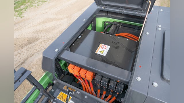 ‘Als je de kappen achter de cabine opent, zie je de cooling van meerdere onderdelen, het reservoir van de ruitensproeiervloeistof en de laagspanning accu’s met massaslot. Verder hoeft er ook weinig te zitten. De deur daarachter zie je het grote accupakket, met een reservoir voor het koelpakket van de accu’s. Ook zitten hier de zekeringen van het hele systeem. Je kunt daar prima bij vanaf de grond. Aan de andere kant van de machine kijk je ook tegen het accupakket. Dat is goed beschermd bij mogelijke schade aan de machine. De deur daarvóór vind je de hydrauliektank en het peil. Tot slot zie je het hart van de machine: de elektromotor en de pompen, met het servofilter en de vetpot. Ik vind het heerlijk eenvoudig en makkelijk voor iedereen.’