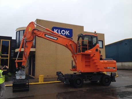 De gloednieuwe Doosan DX120W graafmachine van Klok Containers uit Rotterdam is voorzien van een cabineverhoging van anderhalve meter. Hierdoor kan de machinist bij het verwerken en recyclen van afval vanuit de hoogte op zijn werk neerkijken.