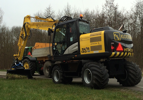 Kloosterman in Kapelle kon nog net voor het paasweekeinde de sleutels van een nieuwe Hitachi ZX140WT-5 mobiele graafmachine in ontvangst nemen. Machinist Cornelis van Liere kon direct in de cabine plaatsnemen om wegbermen af te werken met de nieuwe machine.