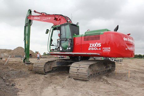 Het merendeel van de graafmachines van Den Breejen Infra uit Cruquius draagt de naam Hitachi. Recent ging een tweede nieuwe 25-tons Hitachi rupsgraafmachine voor Den Breejen aan de slag. Het belangrijkste kenmerk bij deze machine is de 14 meter reikwijdte gemeten vanaf het hart van de machine.