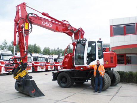 <strong>Gebroeders Pladdet BV leverde onlangs de eerste Hitachi ZX 140 W-2P mobiele graafmachine af, voorzien van een hydraulische verstelarm. Loonbedrijf Inghels in Sint Jansteen (Zeeuws-Vlaanderen) nam deze machine in ontvangst.</strong>