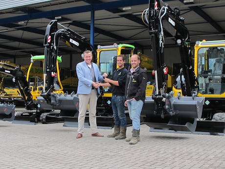 Onlangs overhandigde Arthur Plomp, vestigingsmanager van Hans van Driel B.V. namens de Kemp Groep de sleutels van drie Kobelco minigraafmachines aan Wim en Peter van Schie van de Van Schie Groep uit Mijdrecht.