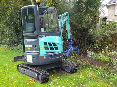 Stephan Treur uit Wilnis heeft een nieuwe Kobelco SK75SR midi-rupsgraafmachine in gebruik genomen. De 7,5-tonner is uitgerust met Kobelco's iNDR motorkoelsysteem, waarmee de machine extra stil is.