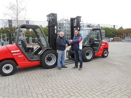 <p style="text-align: center;"><small>Arno Bosch (links), directeur van AB Tribunes, krijgt de sleutels van de twee Manitou heftrucks overhandigd van Dennis van Rijn, van Manitou dealer VHS Bladel.</small></p>