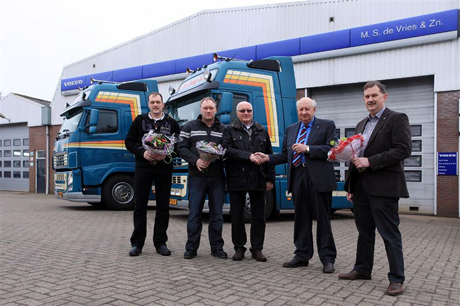 <p><small>De feestelijke overhandiging van de sleutels van de nieuwe Volvo FH 500. Van links naar rechts: Roelof de Jong (Fa. K. de Jong & Zn.), Klaas de Jong Jr. (Fa. K. de Jong & Zn.), Klaas de Jong Sr. (Fa. K. de Jong & Zn.), Marten de Vries (M.S. de Vries en Zonen) en Piet de Vries (M.S. de Vries en Zonen).</small></p>Firma K. de Jong & Zn. uit Jirnsum heeft een <a href="http://www.volvotrucks.nl">Volvo FH</a><p><strong> in ontvangst genomen. De truck, die door Volvo Trucks-dealer M.S. de Vries en Zonen werd afgeleverd, beschikt over 500 pk. K. de Jong & Zn. bestaat dit jaar 75 jaar. Al sinds de oprichting kiest het transportbedrijf voor Volvo, vanwege de goede relatie met de dealer en de kwaliteit van het product.</strong></p>