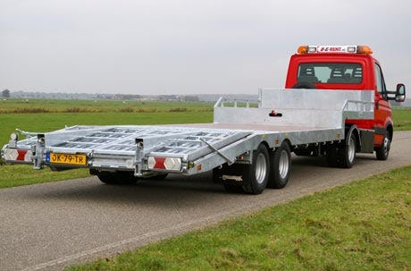 Om alle hoogwerkers en heftrucks veilig te kunnen laden, heeft Veldhuizen een nieuw type oplegger ontwikkeld. Deze oplegger heeft een oprijhoek van slechts 8° en is ontworpen voor wiellasten van 2000 kilogram.