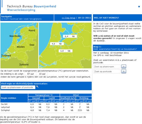 Op de site <a href="http://www.weerverlet.nl">www.weerverlet.nl</a><p><strong> is voor aannemers en bouwvakkers snel na te gaan of het onwerkbaar weer is of niet. Aan de hand van vijf korte vragen weet iedereen waar hij/zij aan toe is. Het nieuwe instrument is ontwikkeld door Technisch Bureau Bouwnijverheid / Weerverletbestrijding, een samenwerkingsverband van cao-partijen in de bouw. </strong></p>