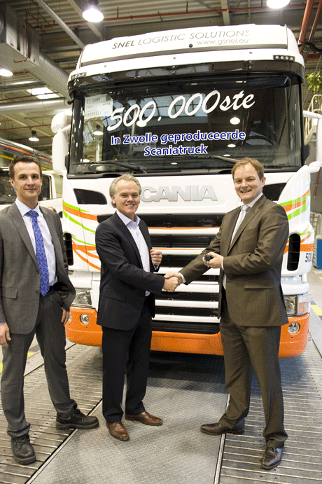 Op 22 december jl. werd bij Scania Production Zwolle de mijlpaal van de 500.000ste Scania bereikt. De vrachtwagen is afgeleverd aan Gert Snel van het gelijknamige transportbedrijf. De 500.000ste Scania maakt deel uit van een order van negen Scania G420 EEV-trekkers die in de Belgische vestiging Deinze worden gestationeerd.