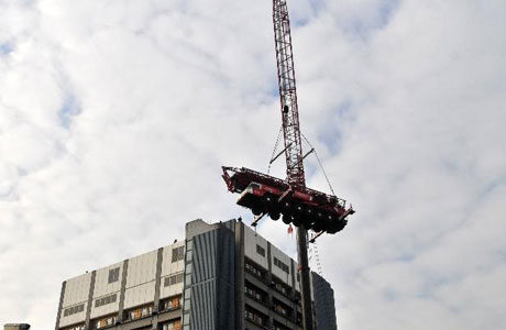 Omdat er boven op het dak van het LUMC te Leiden een extra verdieping komt, moest er een mobiele kraan op het helidek worden gezet, die deze klus gaat klaren.