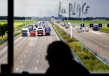 <strong>Vrachtwagenchauffeurs hebben op achttien snelwegen langzaam-aan-acties gehouden. Uit protest tegen de in hun ogen hoge brandstofprijzen reden ze van even voor 12.00 uur tot 12.30 uur niet harder dan 50 kilometer per uur.</strong>