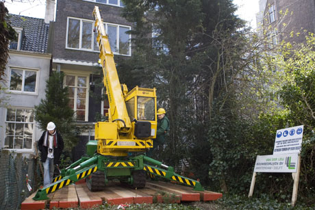 De redding van de Anne Frankboom is begonnen. De boom is ziek en wordt met ijzeren palen vastgezet zodat hij niet om kan vallen.
