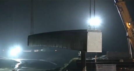 Van Hattum en Blankevoort plaats deze week de liggers op de peilers voor de nieuwe brug over het Wilhelminakanaal in Tilburg. Het transport van de enorme betonnen liggers van 58 meter was vanochtend te zien in RTL ontbijtnieuws.