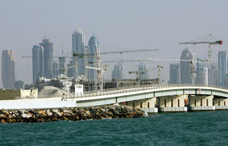 <p><strong>Bouwkranen domineren in de Golfstaat Dubai (Verenigde Arabische Emiraten) de skyline van Palm Jumeirah, een in opdracht van projectontwikkelaar Nakheel kunstmatig aangelegd eiland.</strong></p>