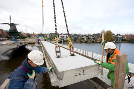 <strong>De tweede serie van twintig prefab liggers voor de Julianabrug in Zaanstad zijn op de kelkvormige betonnen pijlers geplaatst. In het voorjaar van 2009 worden de laatste dertig liggers gemonteerd. </strong>