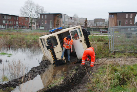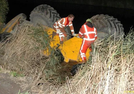 <strong>Donderdag 16 oktober kwam de bestuurder van een shovel, die in Winsum bezig was een dood kalfje weg te brengen, naast de weg terecht. Hierdoor kantelde de shovel en kwam de machine op de kop in het naast gelegen kanaal terecht.</strong>