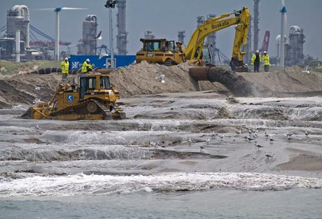 <strong>Nederland is sinds enkele dagen een paar kilometer groter. Voor de kust van Rotterdam is een banaanvormig stuk land opgespoten voor het havengebied van de Tweede Maasvlakte.</strong>