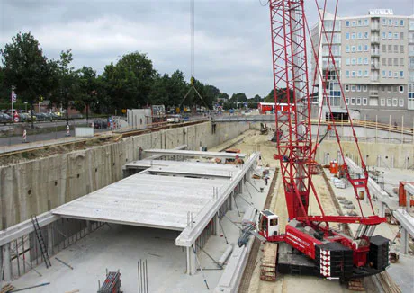 De nieuwe ondergrondse parkeergarage in het centrum van Emmen wordt gebouwd met 385 TT-platen in 160 varianten van Haitsma Beton. De grote diversiteit aan prefab betonnen elementen en de hoge esthetische eisen (CUR-Aanbeveling 100 B1) zijn uniek voor de bouw van parkeergarages.