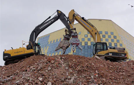 Slopen in een uiterst gevoelige omgeving. Terwijl op 50 centimeter van de buitenmuur van het te slopen gemeentehuis van Hardenberg het volledig nieuwe raadhuis is opgeleverd, dient ook nog rekening te worden gehouden met nabijgelegen woningen en winkelcomplexen. Lagemaat Sloopwerken verricht de sloopklus voor aannemer NTP Groep met nieuwe uitrustingsstukken van Demarec. 'Slopen is omgekeerd bouwen. Het is als het afpellen van een ui. Laagje voor laagje gaan eraf. Daarvoor heb je het beste beschikbare materieel nodig.'