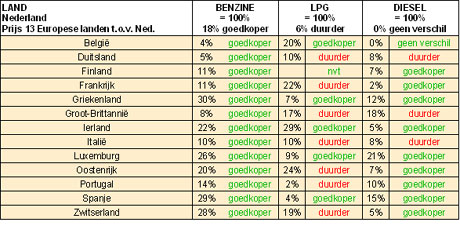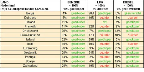 De brandstofprijzen in de Europese landen vertonen nog steeds grote prijsverschillen. De benzine is in Griekenland, Zwitserland, Spanje en Oostenrijk, bijna 30 procent goedkoper dan in Nederland.