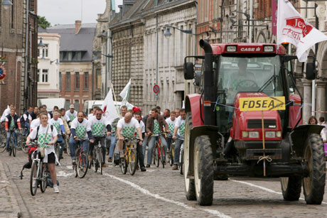 Voorafgegaan door een tractor rijden Franse boeren per fiets naar de stad Arras, om daar te gaan protesteren tegen de stijgende benzine- en dieselprijzen.