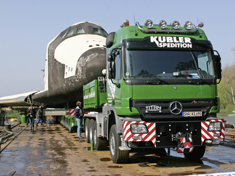 <p><strong>Afgelopen maand werd de Russische space shuttle BURAN in de haven van Rotterdam met een kraan op de zestienassige diepladeraanhangwagen van de Mercedes-Benz Actros SLT 4160 8x6/4 gehesen. Deze combinatie was voor dit uitzonderlijke vervoer op een pontonschip was geplaatst. Vanuit Rotterdam ging de reis in eerste instantie over het water naar Technik-Museum in het Duitse Speyer.</strong></p>