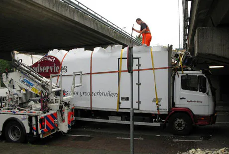 <strong>Woensdagochtend heeft een vrachtwagenchauffeur in Amsterdam-West de laadbak van zijn vrachtwagen finaal opengereten onder het viaduct van de A10 bij de Nachtwachtlaan.</strong>