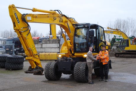 <p><strong>Harm Deckers, verkoopadviseur JCB Waardenburg, heeft machinist Jacco van loonbedrijf Van den Berg, de sleutels van een nieuwe JS 145 W overhandigd.</strong></p>