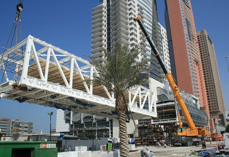 Bouwmachine verhuurbedrijf Al Faris Equipment Rentals aan het werk bij het Jumeriah Lake Towers station, onderdeel van de nieuwe metro van Dubai. Het bedrijf heeft daar twee Liebherr 250 ton mobiele telescoopkranen ingezet om een 140 ton wegend constructieonderdeel met een lengte van 32 meter, dat straks deel uitmaakt van een voetgangersloopbrug, op z'n plek te tillen.
