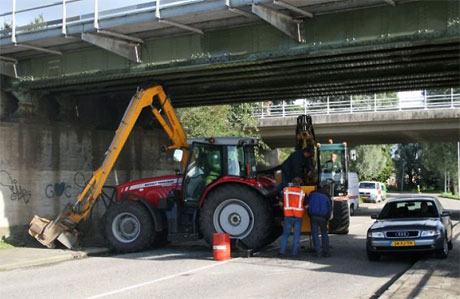Maandagmiddag raakte een trekker bekneld onder een brug in Leeuwarden.