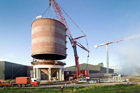 Met een imposante kraan is bij Twence Afval en Energie in Hengelo de reactor van de vergistingsinstallatie op zijn acht meter hoge sokkel geplaatst. De nieuwe installatie stelt Twence in staat ook uit gft-afval energie te winnen.