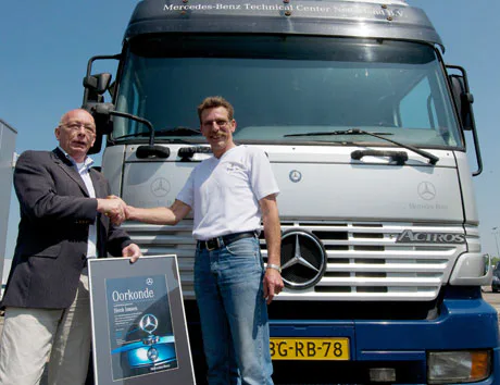 Henk Jansen werd onlangs door Ben Jansen, geen familie maar wel de algemeen directeur van Mercedes-Benz Technical Center Nederland BV in Nijkerk, gehuldigd als Kilometermiljonair. Henk heeft met zijn vaste truck, een Mercedes-Benz Actros 1835 Lowliner, in 12 jaar tijd meer dan een miljoen kilometer gereden.