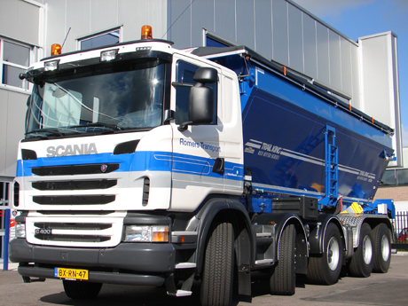 <strong>Romers Transport uit Rozenburg (ZH) neemt in totaal vier nieuwe Scania vijfassers in gebruik. De G 400 10x4/6 chassis hebben vijf assen, waarvan de middelste as door Scania Groningen is bijgebouwd. De dubbele aandrijving en drie gestuurde assen - waarvan één hefbaar - zorgen voor goede wendbaarheid en een nuttig laadvermogen van 31 ton gecombineerd met een laag eigen gewicht. Daarnaast zijn twee van de vier voertuigen voorzien van de zogeheten Red River Live Bottom bandopbouw: een primeur in Nederland op het gebied van asfaltvervoer</strong>.