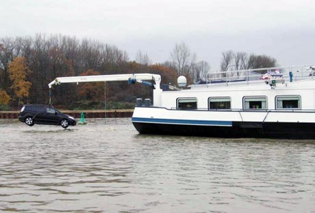 Een Nederlandse schipper bedacht op het Datteln-Hamm-Kanaal wel een heel bijzondere manier om met zijn auto onder de door voor hem te lage bruggen door te kunnen. Dat meldt de Wasserschutzpolizei Nordrhein-Westfalen.