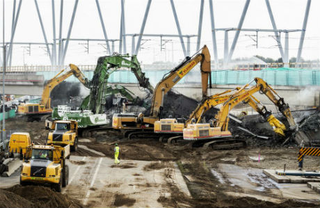 Met man en macht is afgelopen weekend getracht de spoorbrug over de A1 bij Muiderberg te slopen. Maar omdat de steunpunten van de oude spoorbrug sterker bleken dan gezien, verliep de sloop trager dan gepland.