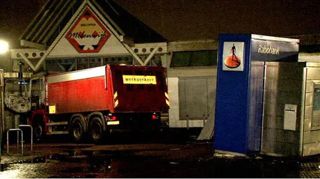In een winkelcentrum in Amsterdam-Noord is een ramkraak gepleegd op een geldautomaat. Een vrachtwagen reed in volle vaart tegen de pui van het gebouw waarin de pinautomaat zat gemetseld. De truck vloog door de kraak in brand, waarop de daders wegvluchtten.
