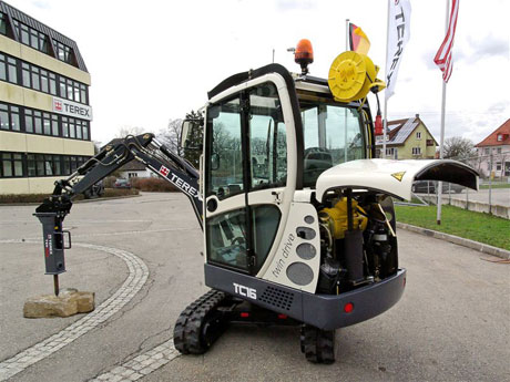 De nieuwe Terex minigraafmachine TC16 Twin Drive heeft verscholen onder de motorkap zowel een diesel- als een elektromotor. De machinist kan gedurende het werk kiezen welke motor hij wist in te zetten.