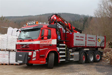 <a target="_blank" href="http://www.hubohuppertz.nl">Hubo Huppertz</a> in Vaals heeft een regelrechte primeur. Het bedrijf nam onlangs een Volvo FM 420 8x2 Tridem in gebruik. De opbouw is voorzien van een haakarminstallatie en een autolaadkraan. Het betreft een standaard 6x2 uitvoering waar een extra gestuurde 7,5 tons voorloopas bij is geplaatst. De Volvo truck wordt ingezet voor het transport van sierbestrating. Het voertuig is geleverd door <a target="_blank" href="http://www.volvotrucks.nl">Volvo Trucks</a><p><strong>-dealer Nebim Elsloo.</strong></p>