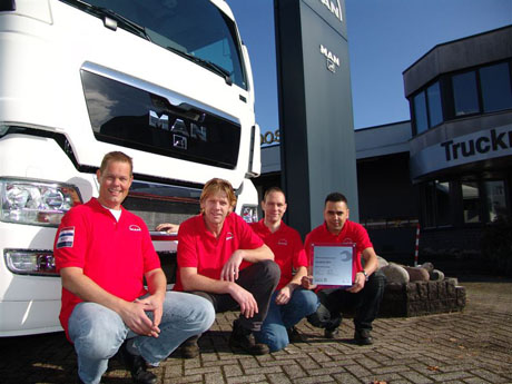 <p><small>V.l.n.r.: Mijndert Pon, Ton Verkerk, Walter Lievens en Mohammed Aziraoui.</small></p>Het team van <a href="http://www.rosiervandenbosch.nl">RosierVandenBosch</a><p><strong> De Meern heeft in München de eerste plaats bereikt van de MAN Service Quality Awards 2011 Regio West. De Awards zijn een internationaal initiatief van MAN Truck & Bus AG, waarbij in vijf rondes wordt gekeken naar performance, professionaliteit en kwaliteit op servicegebied binnen de wereldwijd opererende MAN dealers. Twintig teams namen deel aan de finaleronde. </strong></p>