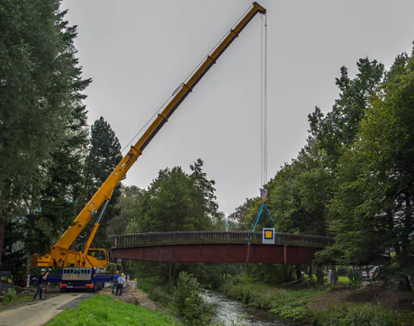 Om een voetgangersbrug over de Ruhr in het Duitse Olsberg te verplaatsen, zette de firma Blüggel een gloednieuwe Terex Explorer 5600 all terrain kraan in. Dit was de eerste keer dat de nieuwe Explorer 5600 in actie kwam.