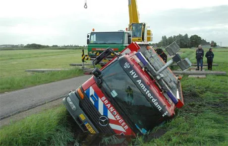 Een brandweerauto is woensdagavond nabij Amsterdam in de sloot terecht gekomen nadat de chauffeur moest uitwijken voor een fietser.