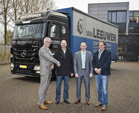 <p style="text-align: center;"><small>V.l.n.r. Nico Schipper (Rüttchen), Richard van Leeuwen (Van Leeuwen Container Service) Bouke Rüttchen (Rüttchen) en Jan Peter van Leeuwen (Van Leeuwen Container Service).</small></p><a href="http://www.vlcs.com" target="_blank">Van Leeuwen Container Service</a> uit Oosterhout heeft de laatste Actros 2544 van een serie van twintig in gebruik genomen. De <a href="http://www.mercedes-benz.nl" target="_blank">Mercedes-Benz</a><p><strong> vrachtwagens zijn voorzien van een ingenieus systeem waarmee het transportbedrijf snel en gemakkelijk wissellaadbakken op- en afzet.</strong></p>