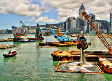 <p><strong>Mensen die gebruik maken van de voetgangersbruggen bij de Centraal Ferry Pier in de Victoria haven van Hong Kong ondergaan al maandenlang het indrukwekkende spektakel dat zich afspeelt aan de havenkant van Wan Chai. Pontons, boten, kranen, hoppers en tal van andere materialen werken gestaag aan een landwinningsproject.</strong></p>