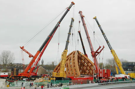 Zes kranen tillen Accoyabrug Sneek (foto's)