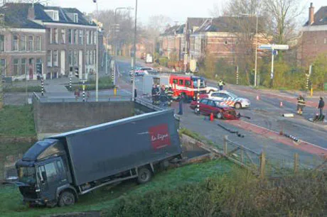 Na een heftige botsing met een auto op een kruispunt in Zutphen is gisterochtend na zeven uur een vrachtwagen op het talud naast de Hoofdgracht tot stilstand gekomen. Het scheelde niet veel of de vrachtwagen was in het water gereden.